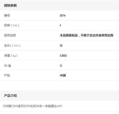 產品名字:世達10件套6.3MM系列50mm長一字旋具頭4MM