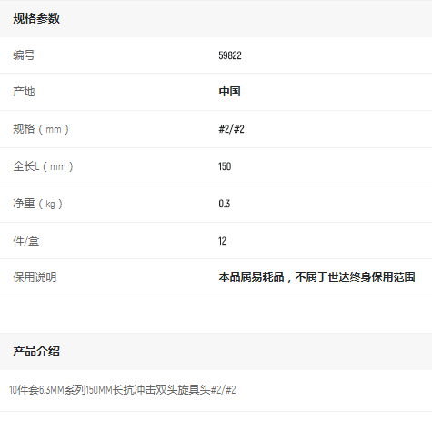 產(chǎn)品名字:世達(dá)10件套6.3mm系列150mm長雙頭旋具頭#2/#2