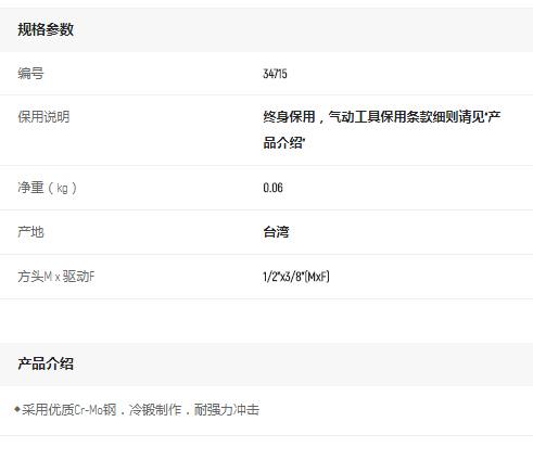 首頁>產品中心>扳手、手用套筒>套筒配件>世達3/8"系列風動轉接頭(3/8"方孔x1/2"方頭)