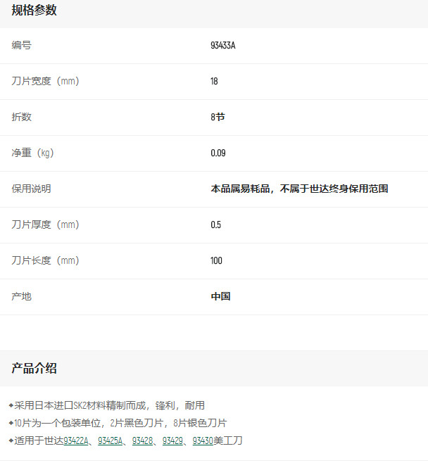 產品名字:世達10件美工刀片8節